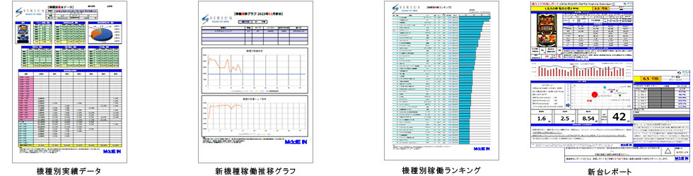 □ ホール分析レポート ・店舗設置全機種データの集計・分析 ・ランキング形式によるカテゴリ別の機種実績一覧 ・主力機種分析、仕事率分析、設定別効果検証、 適正台数考察、 MYランキング、新台分析等で構成 □ WEB SIRIUSアカウント |